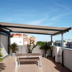 – Toldo Veranda: es motorizado y permite el desplazamiento de una lona en constante tensión de forma horizontal al suelo. Ideal para cubiertas de cristal, invernaderos y jardines.