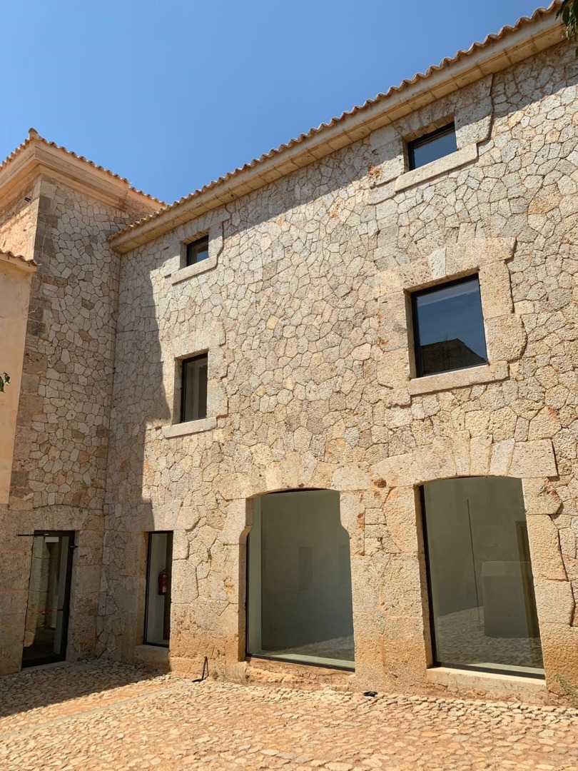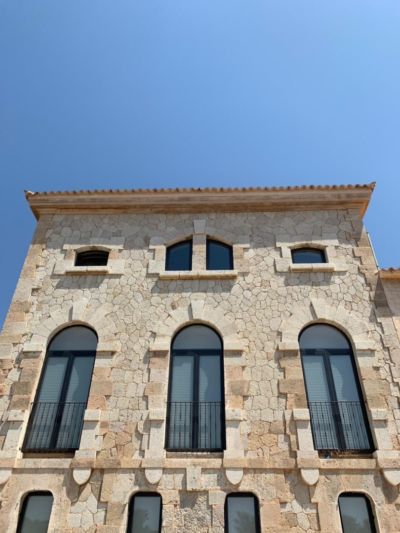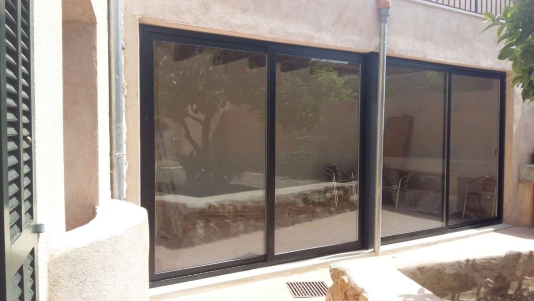 Ventanas abatibles y fijos de aluminio adaptados a la forma y huecos de la fachada en color negro sable 2100 con cristales acústicos.