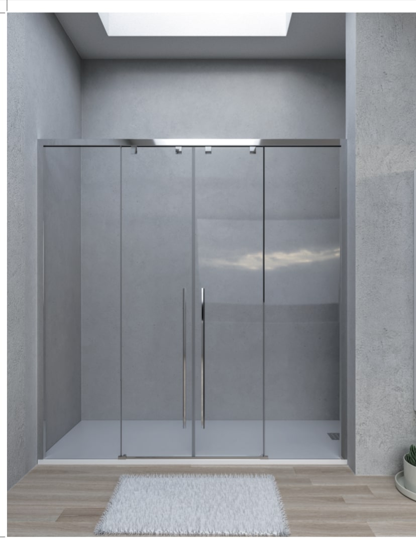 Mampara de ducha de 2 hojas correderas y 2 hojas fijas, de aluminio en color cromo con cristal templado de 6 mm transparente y tratamiento antical.